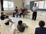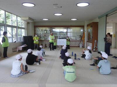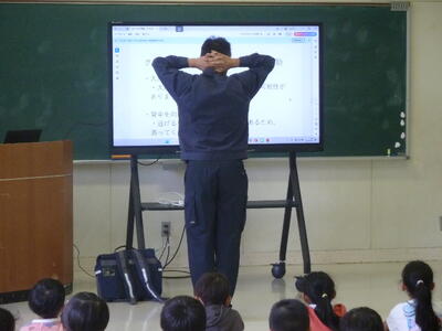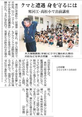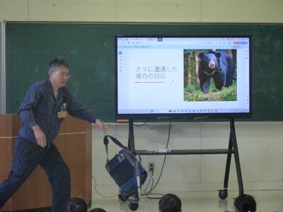 現在、山形県では「クマ出没警報」が発令されており、発令期間が11月30日まで延長されています。高松小学区でも9月にクマが目撃されています。発見場所は、児童の通学路でもあることから、翌日の登下校は、緊急対応として、保護者に車による送迎をお願いしました。しかし、万が一児童がクマに遭遇してしまった時に備え、10月7日(火)の朝会で、山形県保健福祉環境部環境課の大久保課長さんにお越しいただき、クマと遭遇した時の対応について、実演を交えながら説明していただきました。