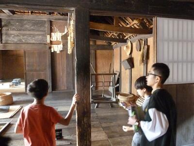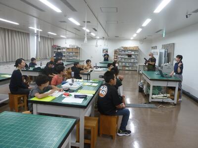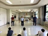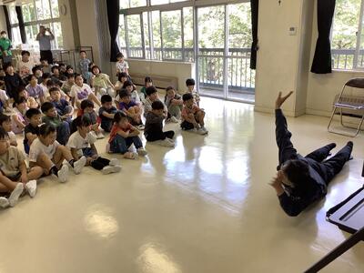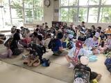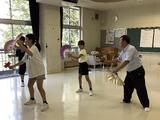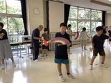 次に、大黒舞を披露していただきました。腰を下げて姿勢を低くしたり、扇子や小槌を動かし掛け声をかけたりしながら踊る姿に、子どもたちは見入っていました。さっそく練習してみると、扇子の回し方が難しく、手が痛くなる生徒もいました。これから何回か練習して、10月の学習発表会で見てもらう予定です。