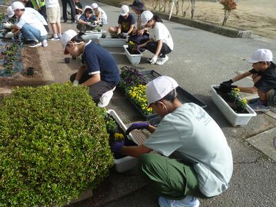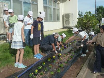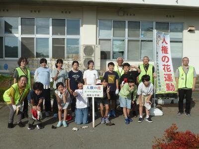 今日は人権擁護委員の方が5名来校し、5年生が一緒に人権の花の植栽を行いました。