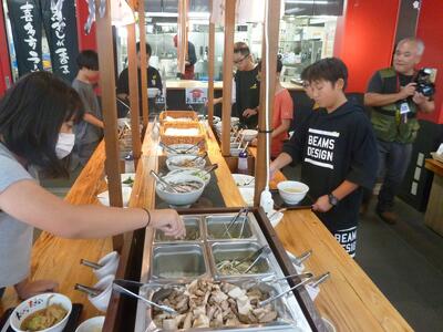 昼食はラーメン館でブュッフェ。最高4杯食べた人も!