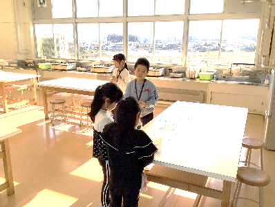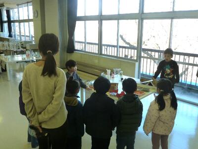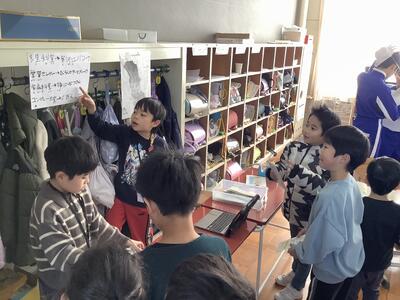 3年生は、総合的な学習の時間に寒河江市の魅力について学習しています。その発表の場として、12月11日のロング昼休みに、全校生に向けて「寒河江市ミニ旅行イベント」を開催しました。3年生は仮想の会社を立ち上げ、児童全員が名刺を持っています。分担した課や係ごとに準備をし、2週間前にはプレイベントを開催して先生たちから意見を収集し、お客さんに喜んでもらえるように話し合ってブラッシュアップしてきました。当日は一人一人が主体的に考えて行動し、大盛況でした。自分たちでやり遂げた今回の経験は、大きな自信につながったと思います。