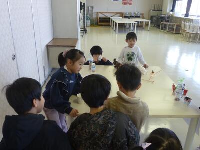 これまで授業で、秋のおもちゃ、ポスター作り、運営の仕方などを準備してきました。当日はお兄さん、お姉さんとして、年長さんが楽しめるように優しく説明していました。1年生の成長を感じました。