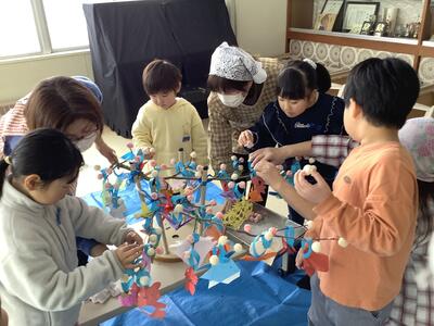 1月14日に、1年生が団子さしを行いました。健康や安全を願う日本の伝統文化であることを知り、団子や折り紙などを木の枝に飾りました。ご協力いただいた小野さん、ありがとうございました。