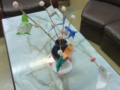 折り紙を折って、団子と一緒に木の枝に飾り付けました。